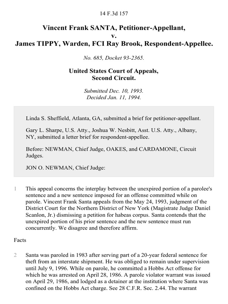 Vincent Frank Santa v. James Tippy, Warden, Fci Ray Brook, 14 F.3d 157