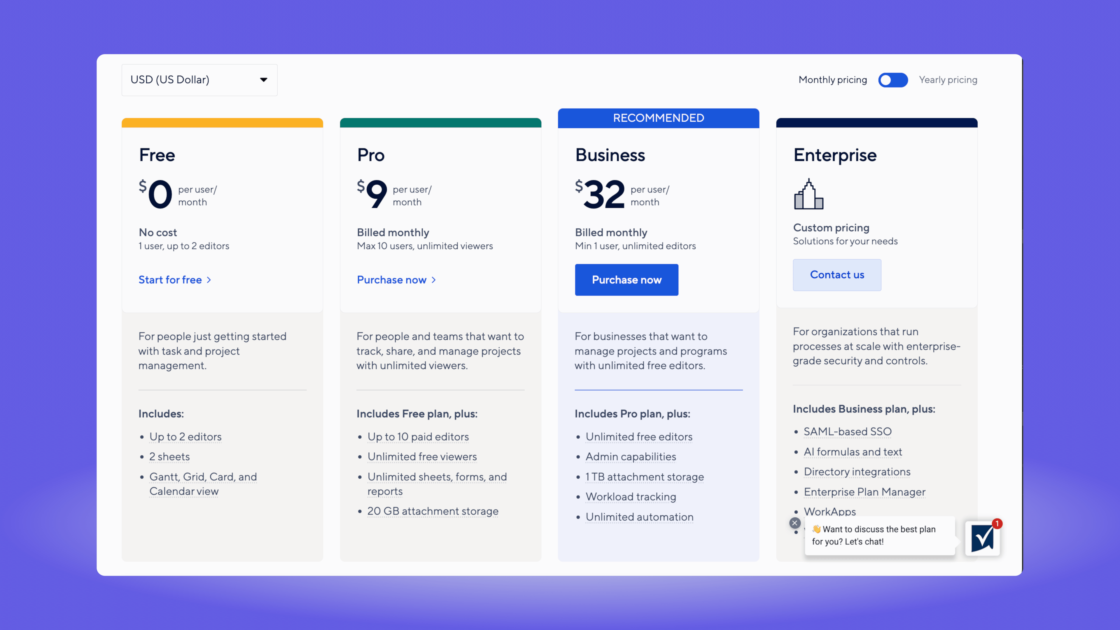Explore flexible smartsheet pricing options, tailored to fit any team's needs. Compare plans to find the perfect solution for streamlining your workflow and boosting productivity. We broke down each plan in terms of cost, features and customizations. The pro plan starts at $12 per. Smartsheet pricing starts at $9 per user, per month for the pro plan, while the business.